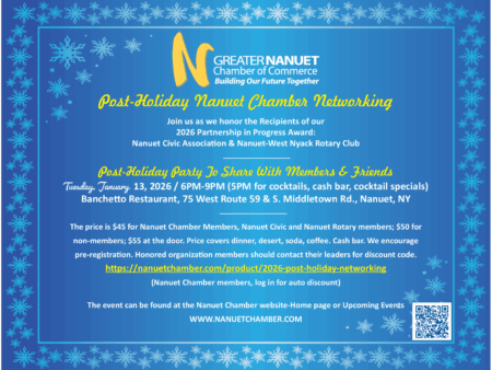 Price is $45 online for Nanuet Chamber members, and members of the honoree organizations. $50 online for non-members, and $55 at the door for all.